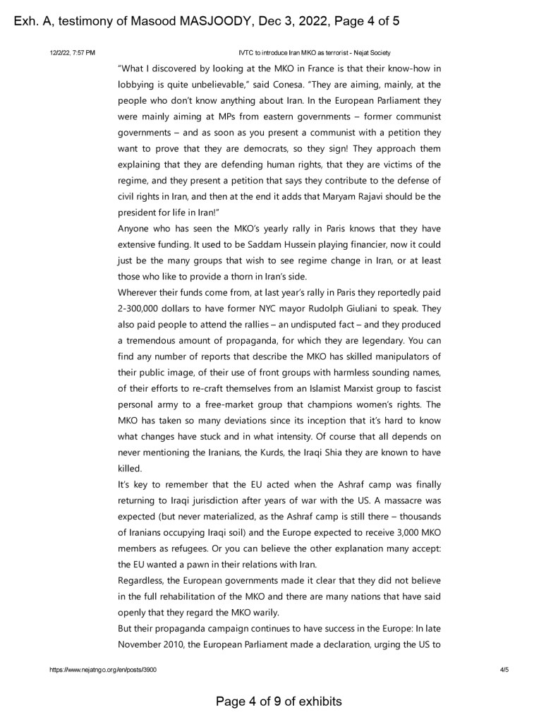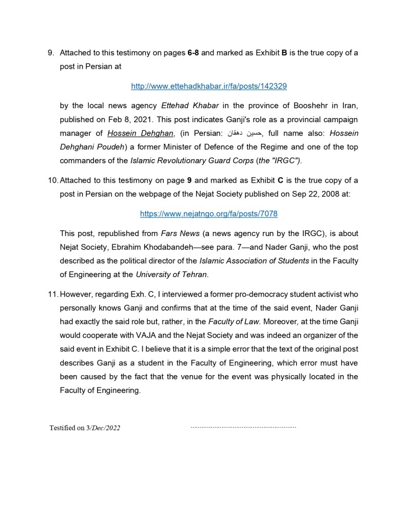 After several attempts at informing the Canadian Border Security Agency (“CBSA”) and Canadian Security Intelligence Services (“CSIS”), and especially considering the apparent neglect or disregard of these institutions concerning the sensitivity of Ganji‘s membership in the MIS, his close ties to Hossein Dehghan, and his prominent role in whitewashing the regime’s crimes and human rights violations at several international meetings, I finally decided to prepare a written testimony supported by several exhibits, my knowledge of the circumstances of the case, and information obtained from a reliable source and former political prisoner in Iran, named Saeed Derakhshandi. My friend Derakhshnadi in particular revealed information regarding the Nejat Society‘s involvement in obtaining the widely broadcast forced confessions of three Iranian-Canadian and Iranian-American hostages held by the regime in or about 2007, i.e. Kian Tajbakhsh, Haleh Esfandiari, and the Toronto-based Ramin Jahanbegloo.