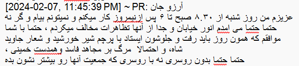 - Feb 7, 2024 — 11:45 PM PT — Pre-letter mobilization (Vancouver). Pourandokht Rostamian messaged Arezou Soltani on WhatsApp, rallying a counter-demo and framing MEK as an imminent threat—the eve of a public letter push. (Doc 8)
