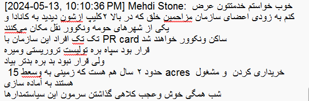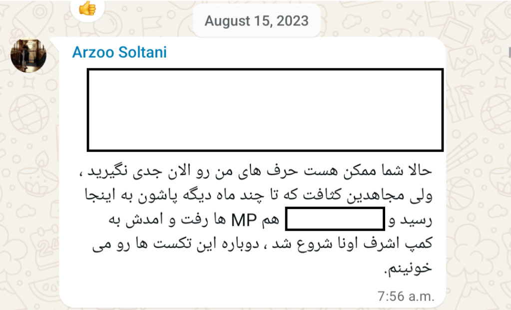 “Maybe you won’t take what I’m saying seriously right now, but the filthy Mojahedin will set foot here in a few months, and [REDACTED] plus MPs will be coming and going to their Ashraf camp—then we’ll read these texts again.” (7:56 a.m.)