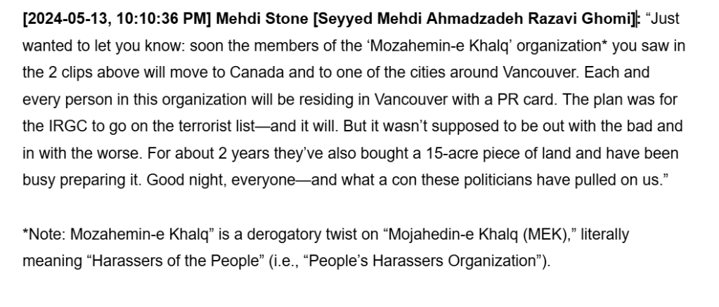 - May 13, 2024 — 10:10–11:05 PM PT — Vancouver escalation & priority-swap made explicit. Mehdi Ahmadzadeh (“Mehdi Stone”) and Arezou Soltani assert: (1) “all MEK members will receive PR cards and live in Vancouver,” (2) a 15-acre site was bought ~2 years earlier for them, and (3) “all staff/volunteers of one Canadian party are MEK” — implicitly referring to the Conservative Party (by their own context), while concluding: “IRGC will be listed, but MEK is worse.” (Doc 11)