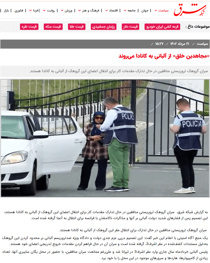 - Aug 12, 2023 — 10:51 IRST — State seeding. IRGC’s Tasnim claims the MEK is moving from Albania to Canada. (Doc 4)