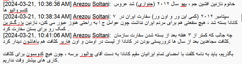 Document 10 and translation: Member of Pahlavi cult, Arezou Soltani, shaming Nazanin Afshin-Jam and calling Stephen Harper “filthy” for shutting down the Islamic Regime’s embassy in Ottawa (WhatsApp Messages, March 21, 2024)