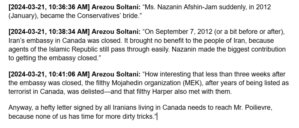 - Mar 21, 2024 — 10:36–10:41 AM PT — Advancing the Priority-Swap Narrative. Arezou Soltani condemns the closure of the Islamic Republic’s embassy in Canada, shames Nazanin Afshin-Jam for her involvement in that event, calls Stephen Harper “filthy,” and links that 2012 embassy shutdown to MEK’s Canadian delisting later that year—then urges a mass letter to Pierre Poilievre. (Doc 10)